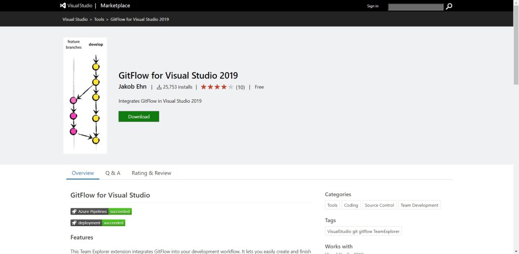 Una vez realizada esta breve introducción, pasaré a comentar cómo poder implementar el uso de esta estrategia en Visual Studio 2019. Para ello, lo primero que hay que hacer es instalar GitFlow desde el Marketplace de Visual Studio 2019.