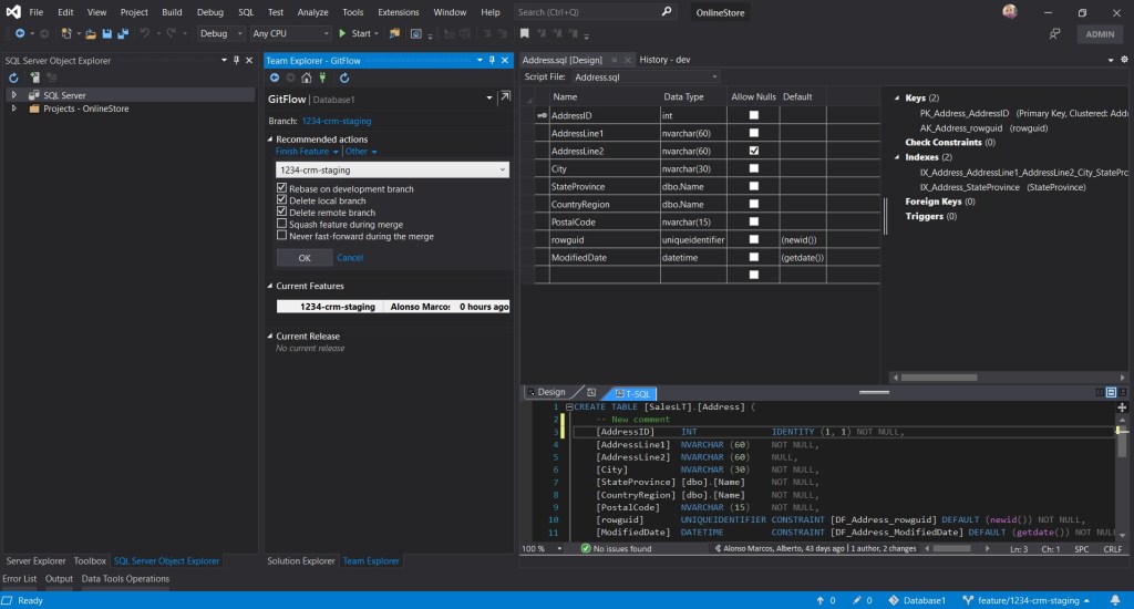 En el ejemplo vamos a crear la rama Feature con el nombre 1234-crm-staging. Para ello, sólo debemos pulsar en Team Explorer, GitFlow, Start Feature y nombrar. Una vez completado estos pasos, sólo queda presionar Create Feature para completar la tarea. Sencillo.