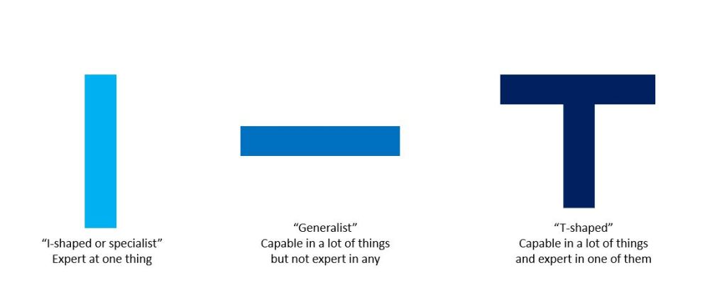 Si bien es cierto que tras realizar varias búsquedas acerca de T-shaped person, he visto que existen otros tipos. Son el pi-shaped o el comb-shaped, que al final vienen a sumar líneas verticales sobre las que se es experto.