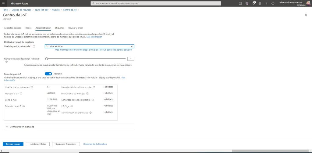 En el ejemplo, elegimos el nivel S1 lo que nos permitirá recibir unos 400.000 mensajes al día. Sin embargo, como antes comentaba, es muy importante conocer el caso de uso, puesto que, en el apartado de configuración avanzada, disponemos de la posibilidad de seleccionar el número de particiones con las que trabajar. Es decir, nos permite elegir entre un mínimo de 2 hasta un máximo de 32.