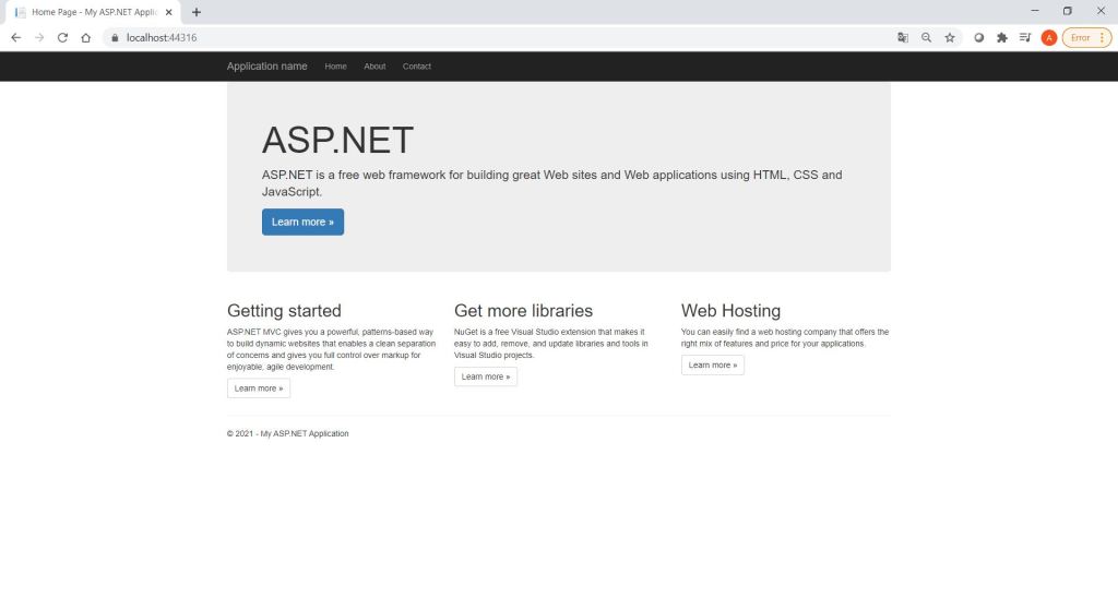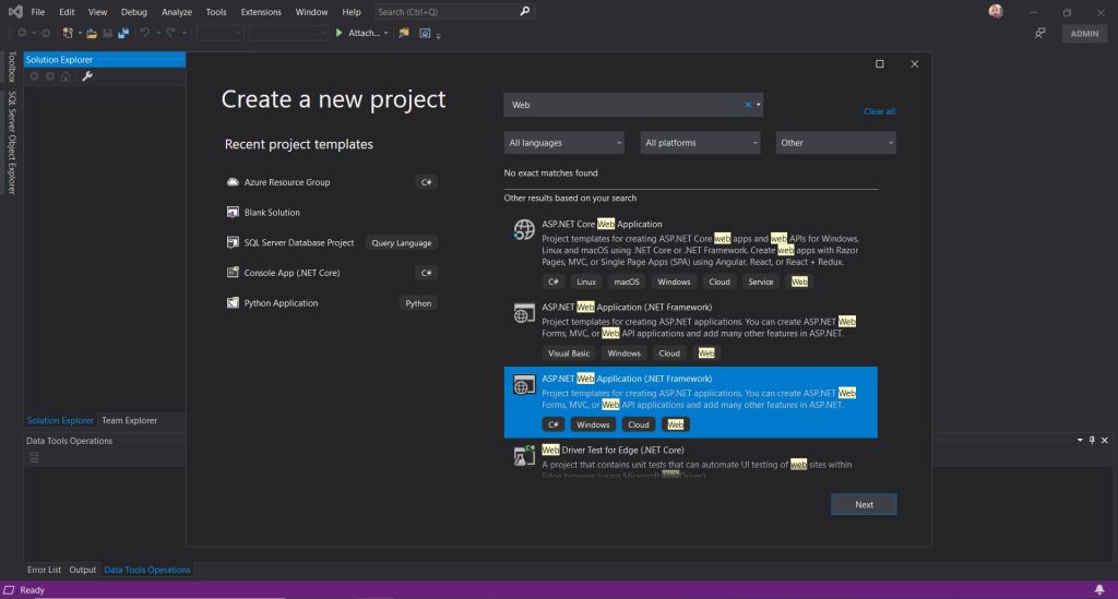 Ahora sólo nos queda crear una aplicación web y vincular nuestro Application Insights. Para ello, creamos un proyecto desde Visual Studio 2019 del tipo ASP.NET Web Application C#, utilizando arquitectura de tipo MVC.