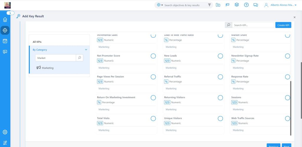 Así que, dependiendo del resultado clave que deseemos utilizar, podremos elegir una u otra alternativa. En este ejemplo, vamos a decantarnos por crear un Increase KPI. De este modo, podremos hacer tracking al número total de visitas al blog. Para ello, la propia aplicación una vez marcado el tipo de resultado clave, nos sugiere algunos ejemplo categorizados, lo que nos facilita la labor de búsqueda.