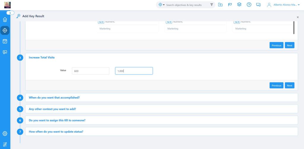 Llegamos al quinto paso. Aquí una vez decidido el periodo de vigencia, disponemos de la oportunidad de renombrar nuestro resultado clave e incluso añadir una breve información en él. Algo que resulta útil, puesto que a veces un KPI necesita algo más de detalle para ser del todo entendido 😉