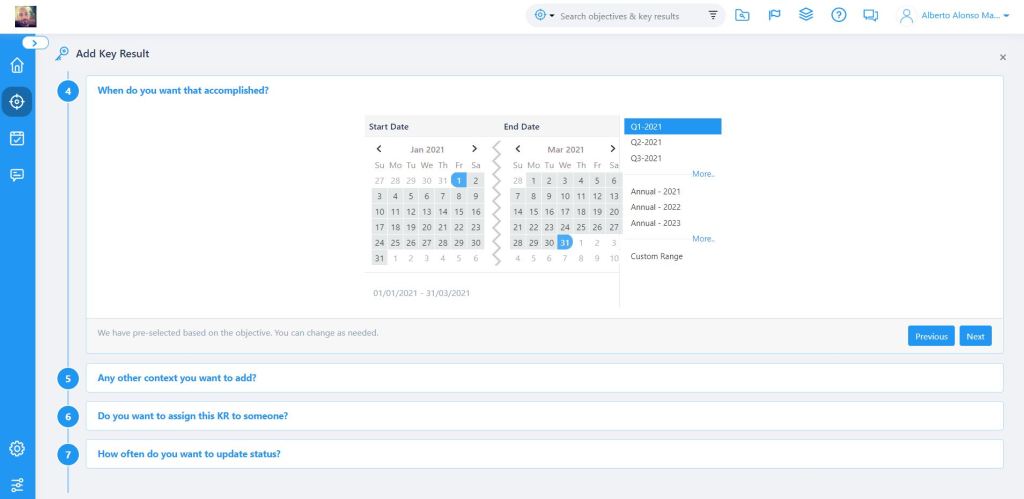 Avanzamos hasta el siguiente paso y aquí podemos seleccionar el rango de tiempo en el que mantendremos la vigencia de nuestro resultado clave que, como vimos al inicio, se corresponde con el primer trimestre del año.