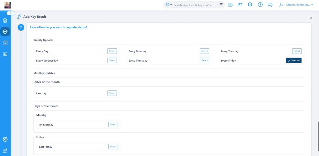 Estamos casi sin darnos cuenta en la séptima parada del trayecto. ¿Qué haremos aquí?. Pues algo tan importante como definir el momento de realizar la actualización de nuestro resultado clave. Como se observa abajo, hay múltiples opciones. En mi caso, la revisión la realizaré los viernes.