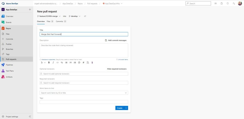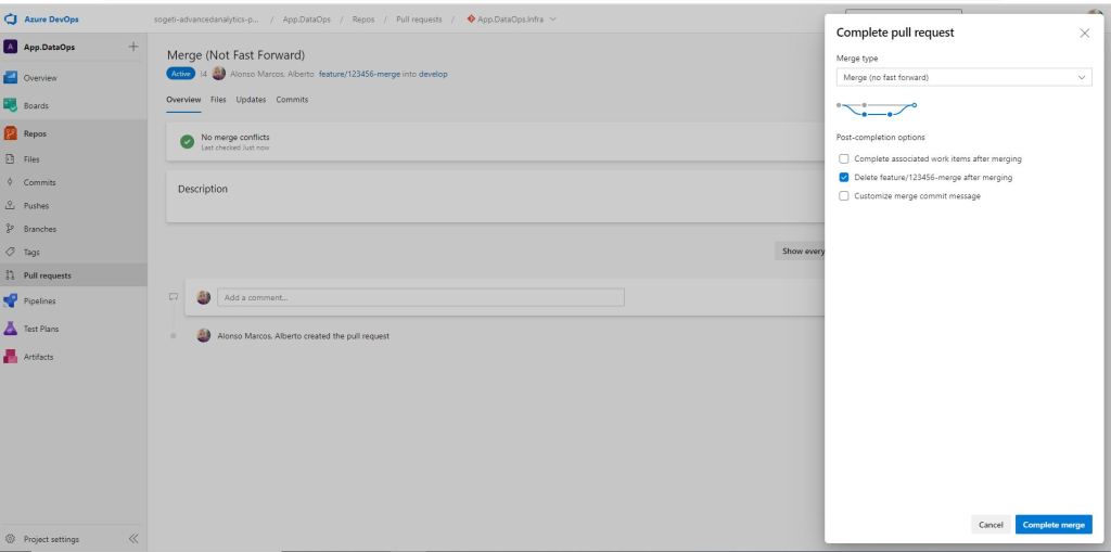 El propio Azure DevOps comprueba que no existen conflictos entre las ramas a mergear y desde la parte derecha, en el desplegable, seleccionamos el tipo de merge que vamos a realizar. En este primer ejemplo, será Merge (no fast forward). Justo debajo existe un conjunto de opciones que permiten: