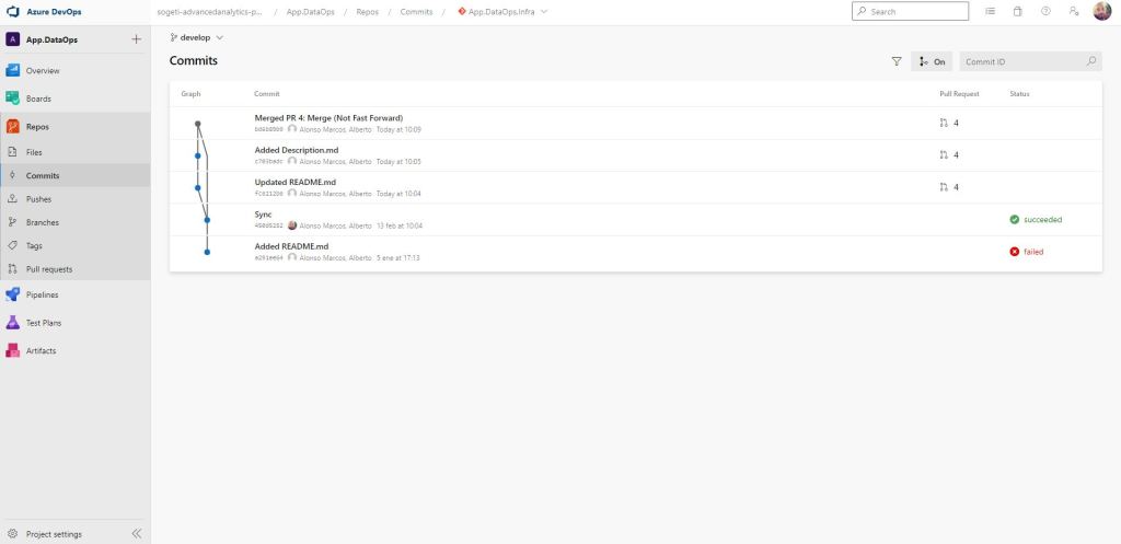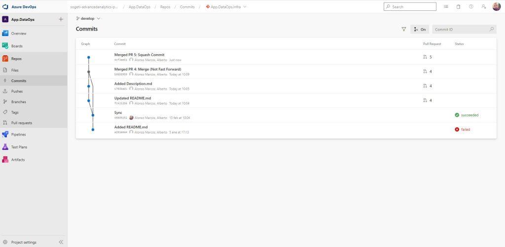 Una vez completada la Pull Request, podemos observar que nuestra rama de feature ya no está. Lógico, decidimos eliminarla al completarse la PR y cuando seleccionamos la rama develop (sobre la que hemos realizado la PR) y vamos a la sección de commits vemos lo siguiente.