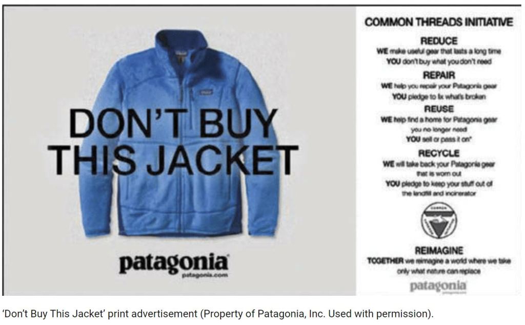 La imagen de arriba, corresponde a una campaña de la empresa Patagonia, donde pone el foco en el consumo responsable. Además de mencionar algunos de los puntos diferenciadores de la compañía y que, por supuesto los clientes, deben considerar al pensar en comprar no sólo esta prenda, si no cualquier otra sea o no de su marca.