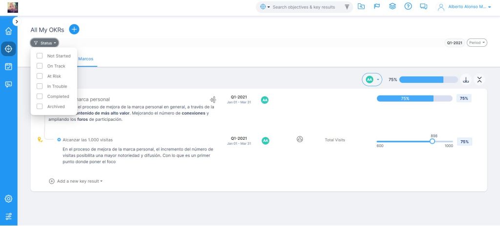 Profit, como herramienta, nos permite completar nuestros OKR de un modo sencillo y del mismo modo, nos ofrece la posibilidad de ir revisándolos, además de modificar el status de los mismos, definiéndolos como:
