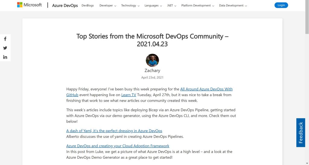 En ese momento, decidí mirar el móvil para ver si había algún amigo había escrito en alguno de los grupos y fue cuando vi que se me había mencionado en Twitter. Zachary Deptawa había incluido uno de mis últimos artículos para SogetiLabs Int. como destacado dentro de la comunidad Azure DevOps de Microsoft.