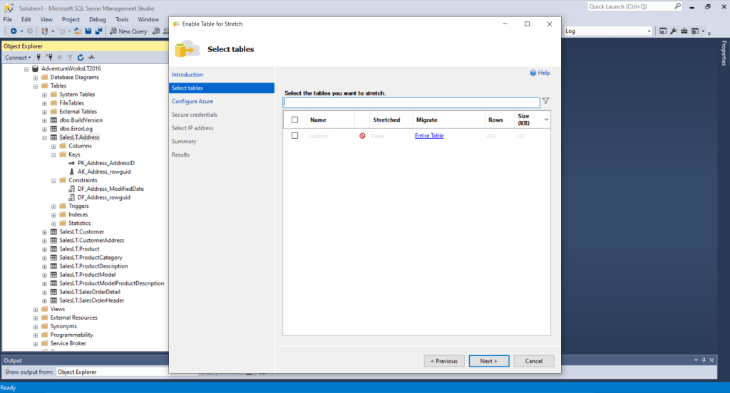 Una vez llegados hasta aquí, sólo queda habilitar SQL Server Stretch a nivel de tabla. Para ello, seleccionamos SalesLT.Address. Al quedar seleccionada, pulsamos sobre el botón derecho y nos aparecerá el menú desplegable, ahora sólo tenemos que clicar sobre Stretch y de nuevo sobre Enable.