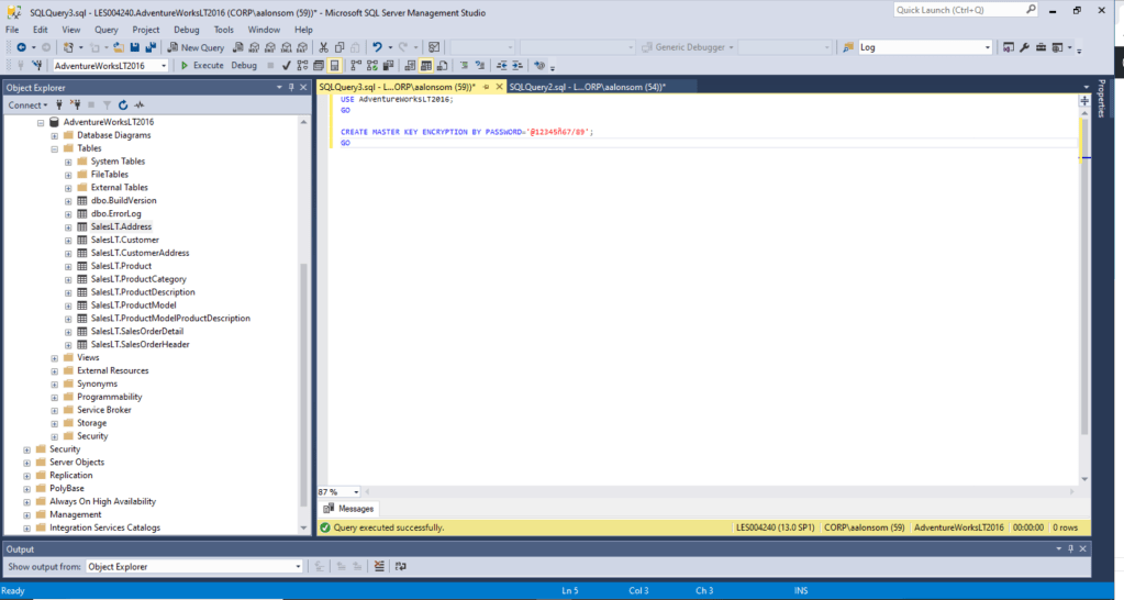 Ahora lo que hay que hacer es crear una nueva credencial para la base de datos de AdventureWorksLT2016 mediante el siguiente script.