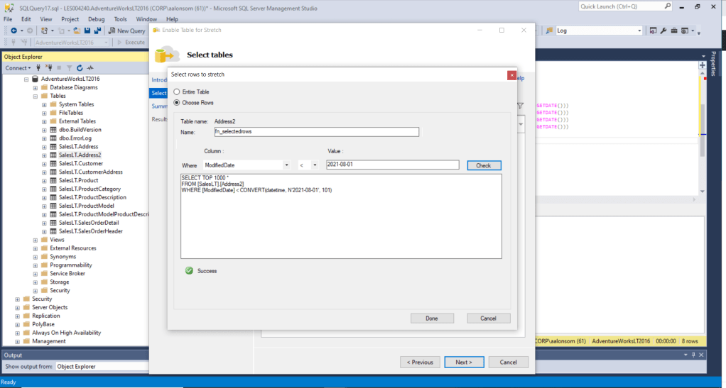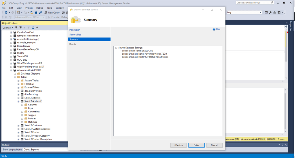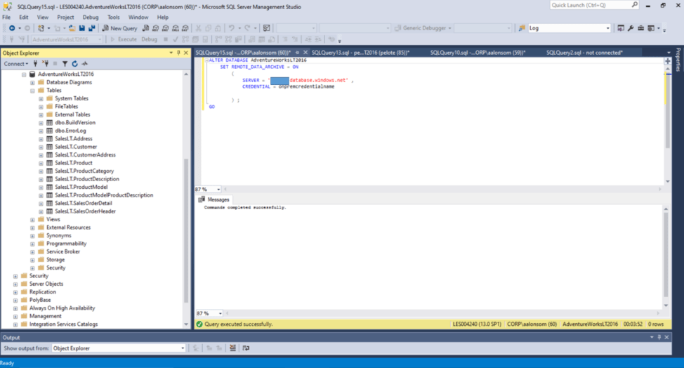 El siguiente paso es configurar el servicio de SQL Server Stretch en la base de datos, que en nuestro caso es AdventureWorksLT2016 mediante la ejecución del siguiente SQL script.