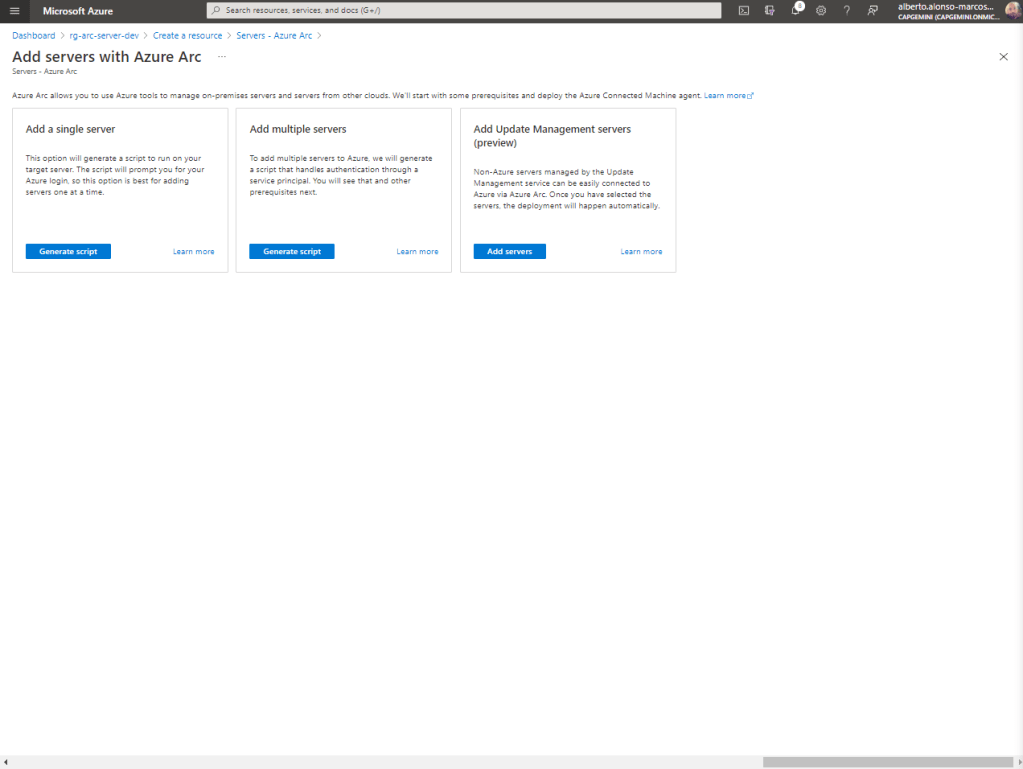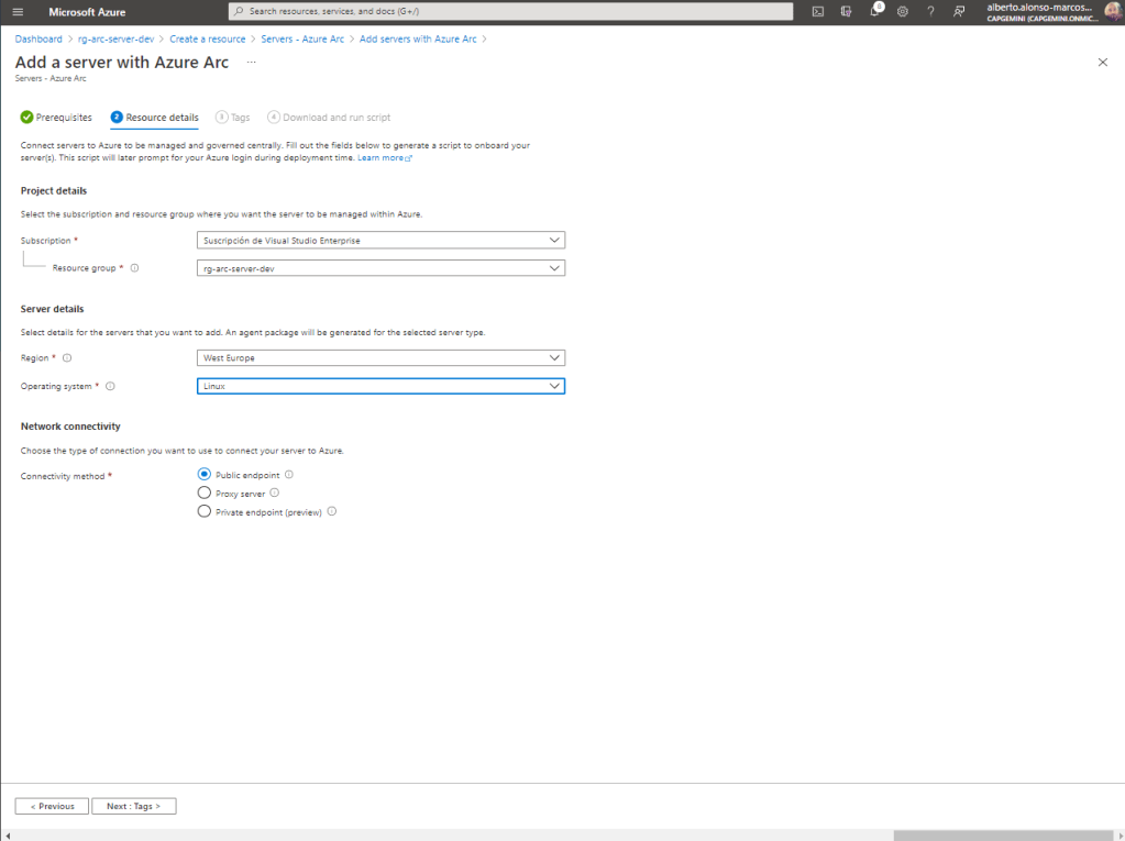 azcmagent connect --resource-group "rg-arc-server-dev" --tenant-id "76a2ae5a-9f00-4f6b-95ed-5d33d77c4d61" --location "westeurope" --subscription-id "1afb941e-4b1b-4d09-88e1-644dde613b1e" --cloud "AzureCloud" --tags "Datacenter='VirtualBox Lenovo',City=Madrid,StateOrDistrict=Madrid,CountryOrRegion=Spain,environment=dev" --correlation-id "186679d0-3031-4873-8591-22601e3e6000"