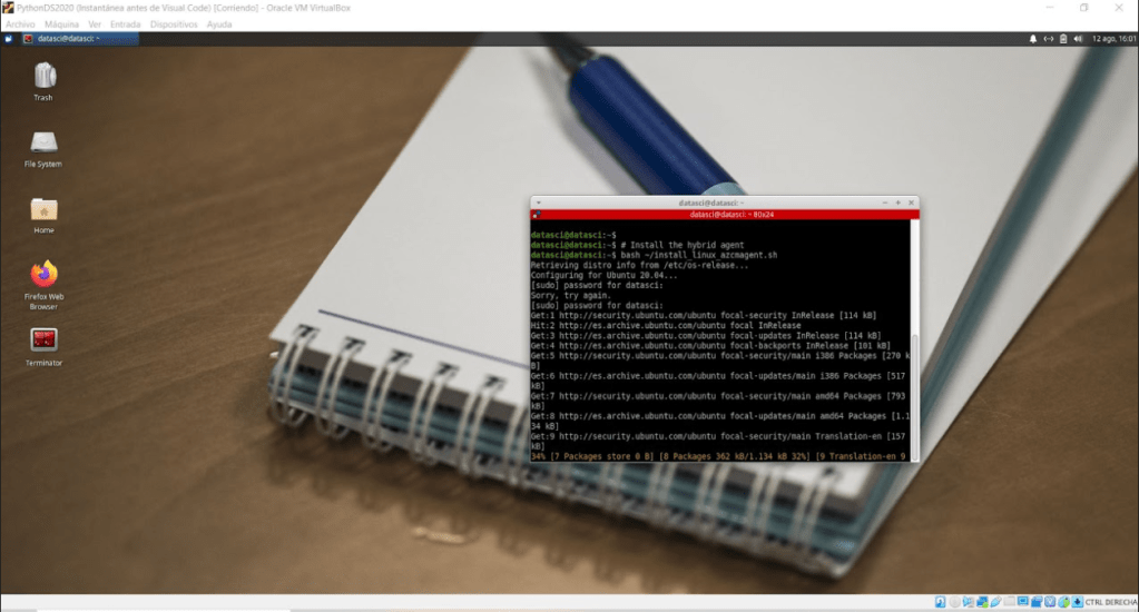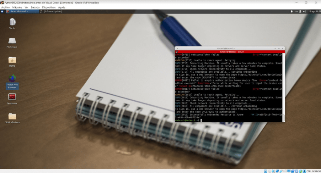 Mientras en otro portátil en el que tengo una VirtualBox con una máquina virtual Linux funcionando, copio y ejecuto el código por la terminal.