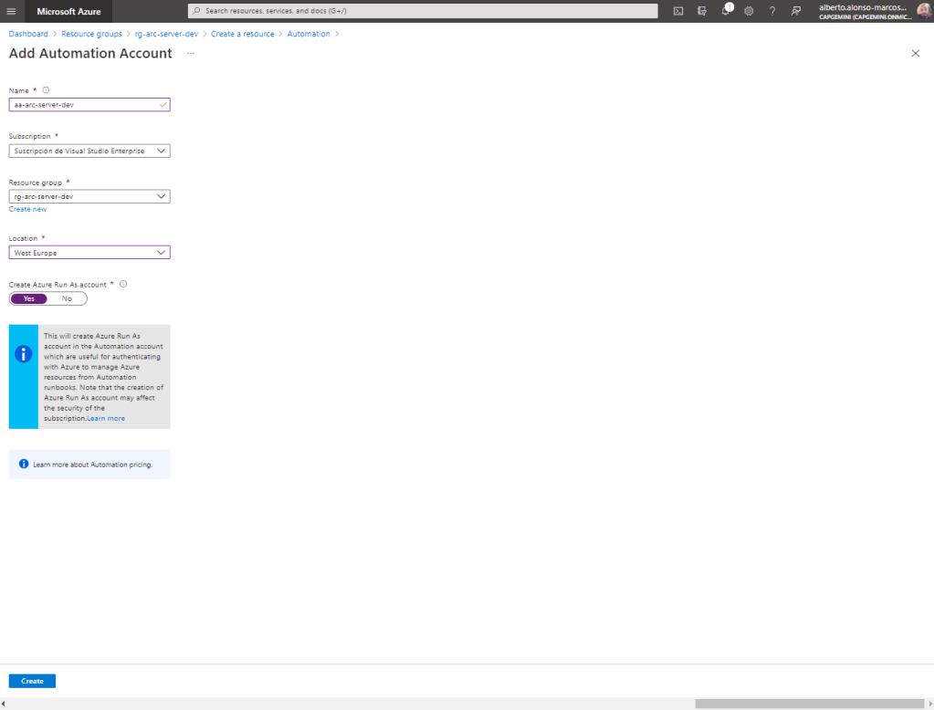Otra capacidad muy interesante es la de poder gestionar los updates de la máquina virtual, para ello previamente hay que crear una Automation Account y configurarla.