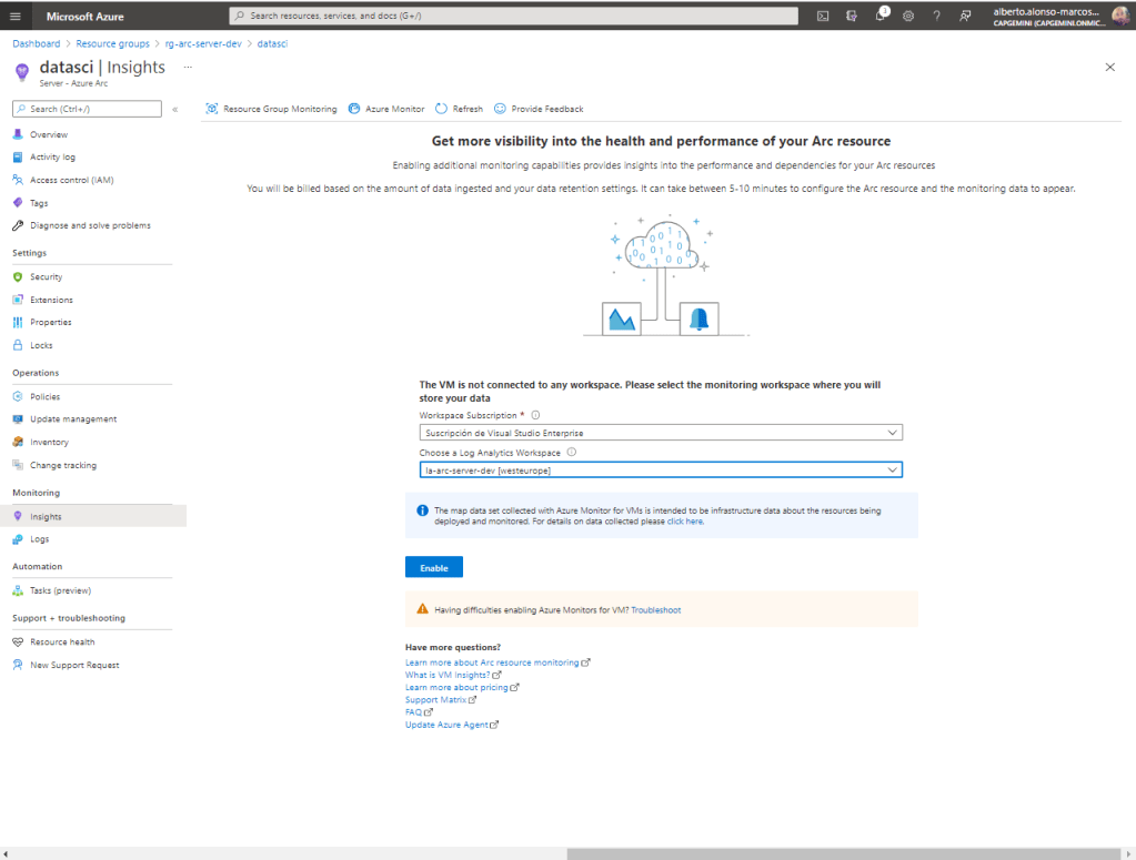 Mientras, he creado un Log Analytics Workspace que es requerido para habilitar Monitoring Insights, que como vemos es tan sencillo como pinchar en el icono y seleccionar el recurso directamente desde el combo y pulsar sobre el botón de Enable. Atentos por que es un proceso que toma su tiempo 😉