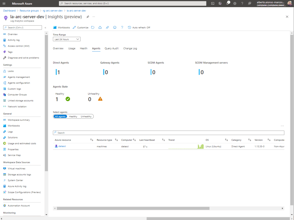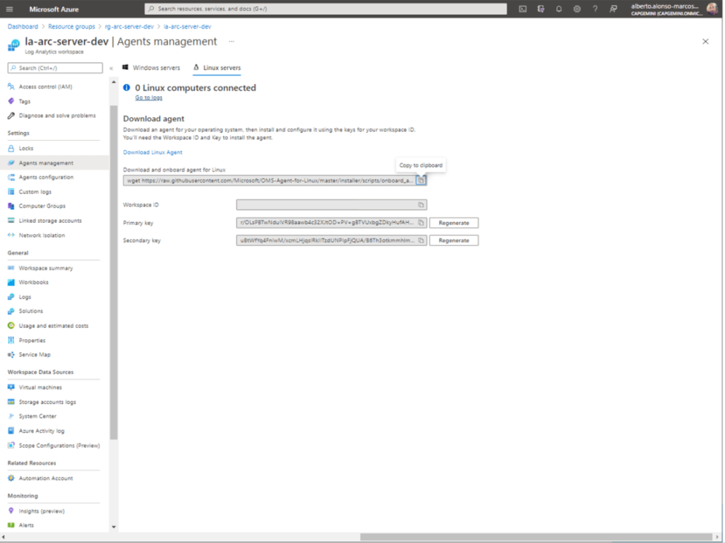 NOTA: en caso de que te de error de configuración, mira a ver si se debe a que no encuentra el OMS Agent para Linux. Si es así, debes seguir las instrucciones que se describen aquí. En el área de Agents management de tu Log Analytics Workspace encontrarás el script necesario para instalarlo tanto en máquinas Windows como Linux. Sólo tienes que copiarlo y ejecutar en tu terminal. Ah!, y mucho ojo a las configuraciones de Python, que te pueden dar un poco por saco 😉