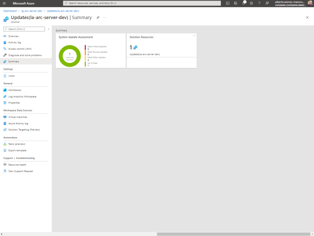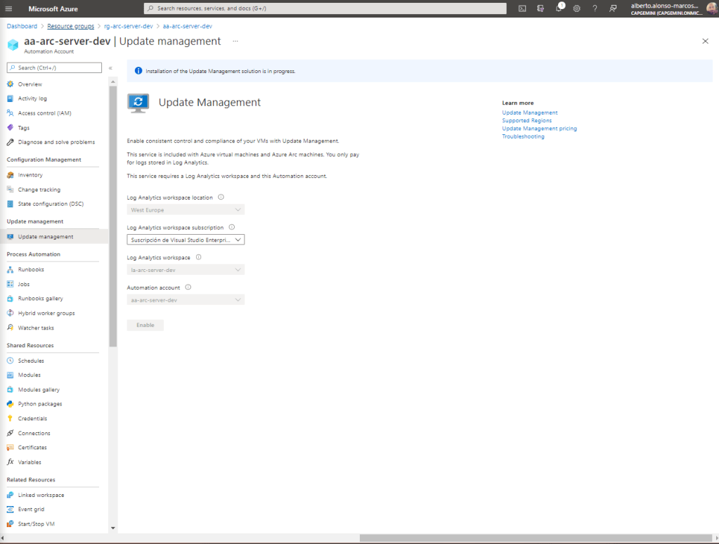 Una vez creada, accedo a ella y desde la sección de Update management selecciono la cuenta de Log Analytics y pulso sobre el botón de habilitar.