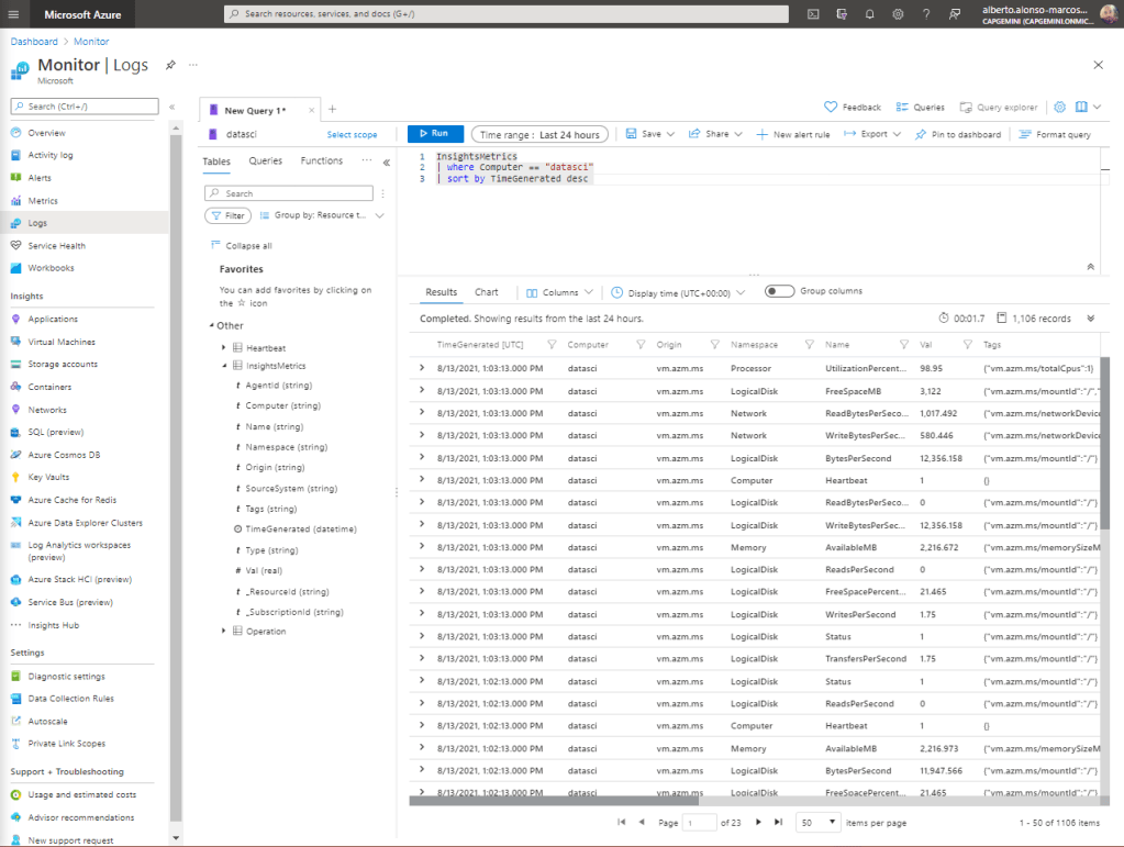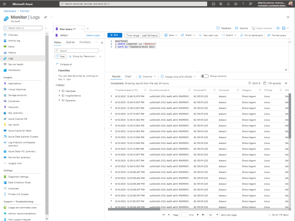 Si ahora voy a Logs y realizo una query veo todos los registros que ya se han ido insertando desde mi máquina on-prem.