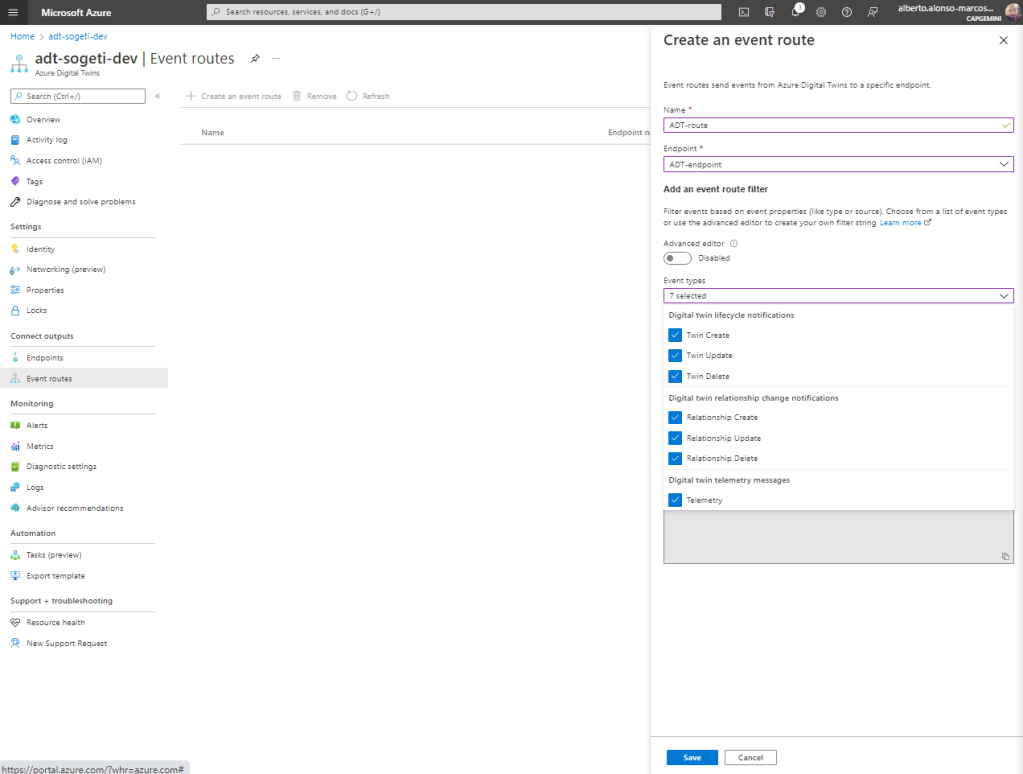 Como sucede con el tipo Service Bus, debemos elegir el tipo de autenticación que deseemos. En mi caso será añadiendo la Policy previamente creada en el Event Hub. Lo siguiente es configurar nuestro Event Route, veamos.