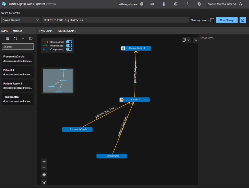 Esto es como cualquier otra solución de grafos, la ventaja radica en que se pueden crear modelos que representen a sensores como los de tensión arterial, frecuencia cardiaca, saturación en sangre, nivel de glucosa, para asignarlos al paciente, y que mediante sus propiedades se vinculen a dispositivos IoT que nos envíen esas señales a través del Event Hub configurado.