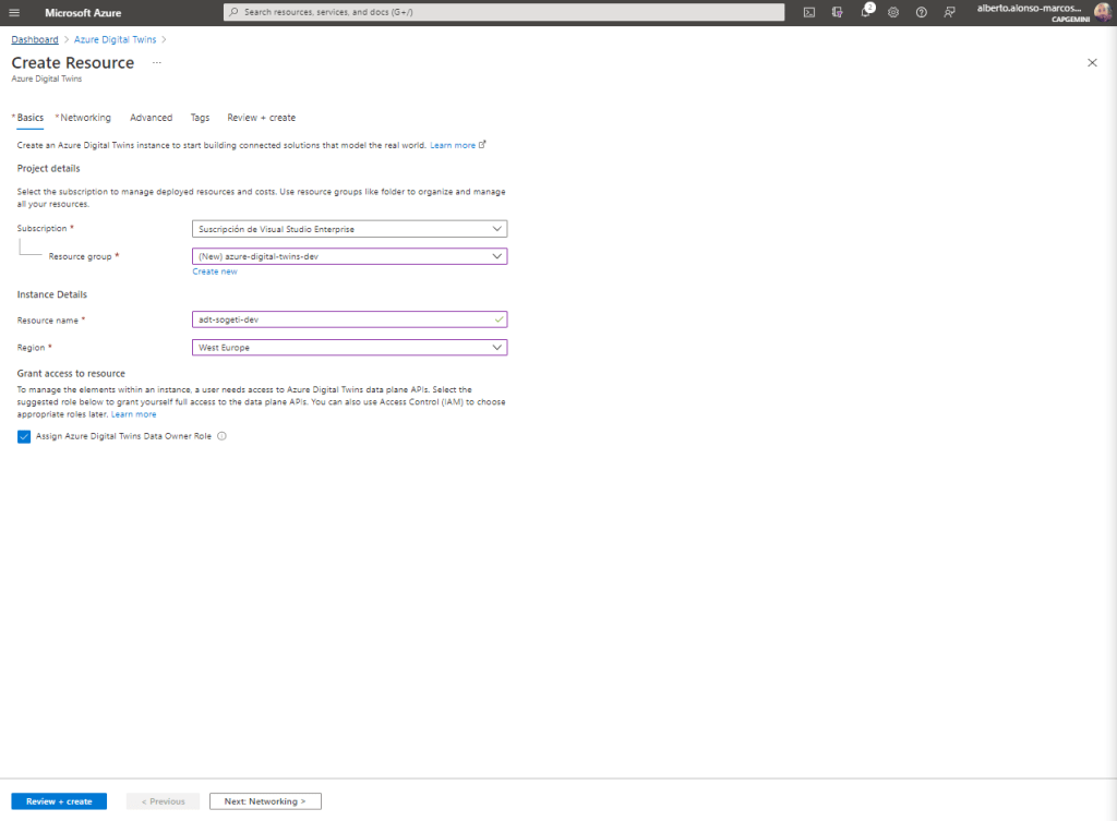 Buenos, pues comencemos a crear nuestro primer Azure Digital Twins. Para ello tan sólo tenemos que acceder a nuestra suscripción de Azure y buscar el recurso de Digital Twins y completar los siguientes pasos.