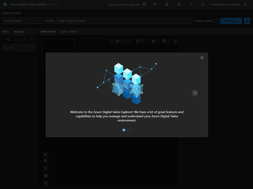 En la primera ocasión que accedes al nuevo entorno, te solicitará la Azure Digital Twins URL que no es más que el Hostname del recurso precedido de https:// en mi caso sería: