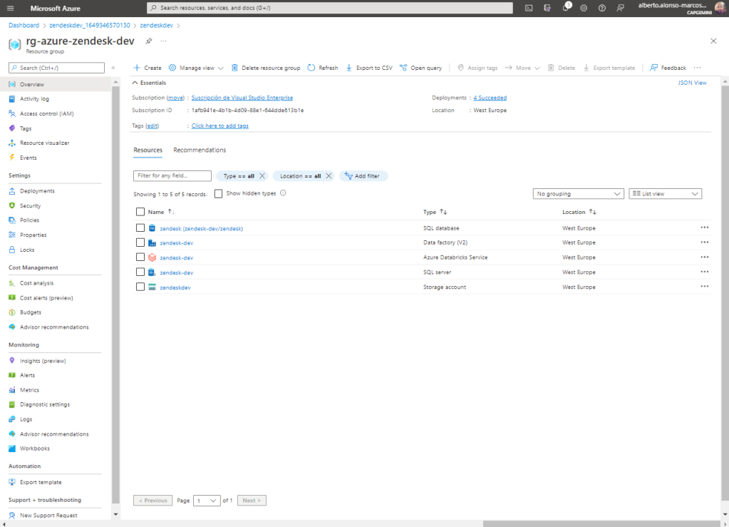 Lo primero es crear los recursos que necesitaremos para replicar esta arquitectura dentro del grupo de recursos rg-azure-zendesk-dev , que entre otros son: