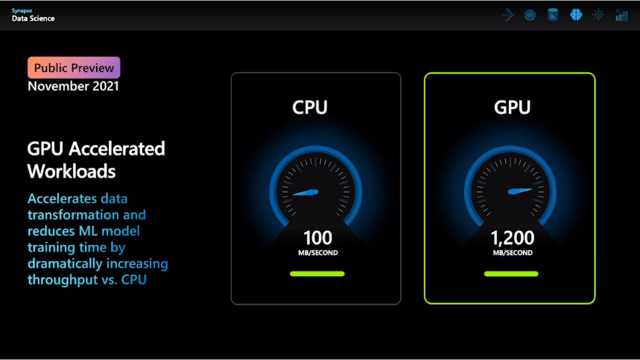 GPU Accelerated Workloads, empezamos a subir la temperatura. Podemos usar en preview, las ventajas del procesamiento mediante GPU de cara a acelerar las transformaciones complejas de datos y/o reducir el tiempo de entrenamiento de nuestras redes neuronales. ¡Un gran impulso sin duda!