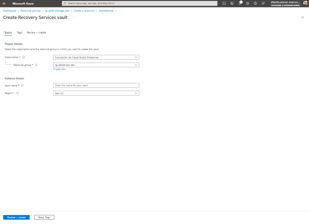 Para comenzar a trabajar con ellos, sólo tienes que ir a tu grupo de recursos y crear un nuevo servicio (en este caso Recovery Service Vault), completar los campos requeridos y pulsar en «Create»