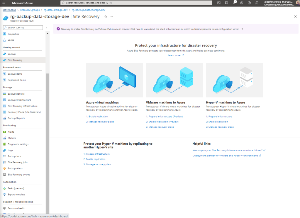 En cuanto a Site Recovery, vemos que al igual que sucedía con Backup, su puesta en marcha es sencilla. Sólo debemos acceder a la sección desde nuestro Recovery Service Vault y configurar el servicio.