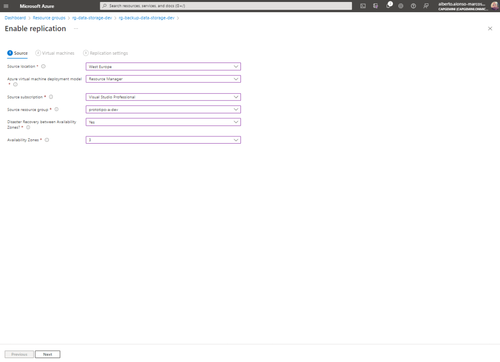 Como se observa en la imagen superior, Site Recovery nos permite trabajar con VM’s sencillas como con VMware o Hyper-V. En nuestro caso utilizaremos la VM desplegada en el grupo de recursos prototipo-a-dev. Para ello, completaremos el formulario como vemos en la imagen de abajo.