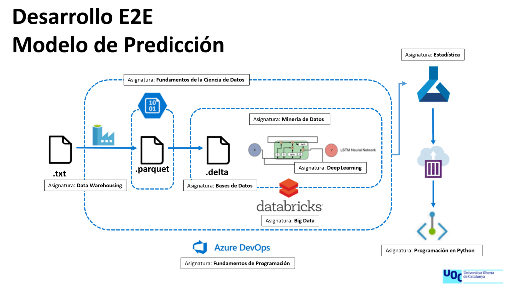 El objetivo era muy ambicioso, sin duda. Pero también tremendamente desafiante, pues me obligaba a poner en valor el conocimiento obtenido, gracias a todas asignaturas que había cursado durante todos estos años de estudio. En la imagen de abajo presento la arquitectura del proyecto y destaco algunas de las disciplinas empleadas.