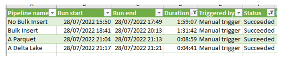 Saltemos ahora al tercer supuesto. Aquí hacemos un cambio de componentes, el primer paso lo que hacemos es persistir el fichero .csv en formato .parquet dentro de un Azure Data Lake Gen2, algo que vendría a ser como nuestro Raw Data, para acto seguido alimentar una tabla Delta Lake, que también está montada sobre un ADLS. ¡Veamos qué tiempos nos ofrece esta combinación!