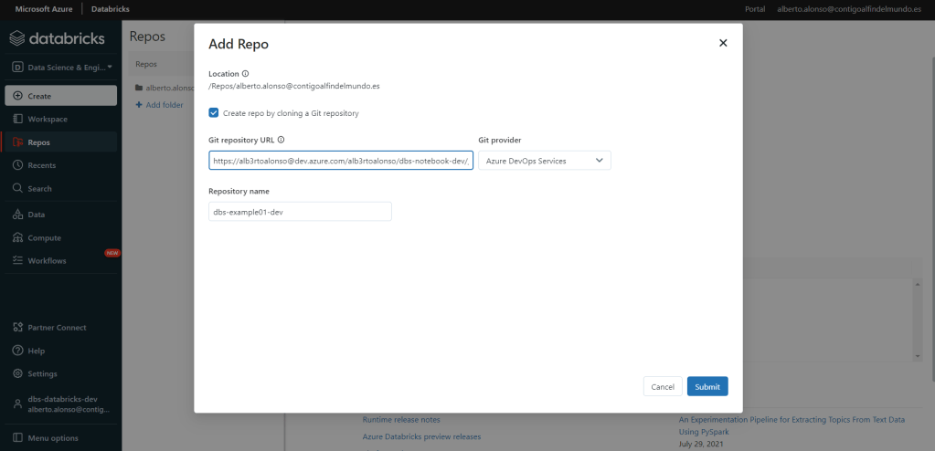 Una vez completado, accedo a la carpeta de Repo de mi Azure Databricks y pulso sobre «añadir nuevo» repositorio. Acto seguido, incluyo la url que puedo copiar desde la pantalla anterior pulsando sobre «Clone» y seleccionando «Https»