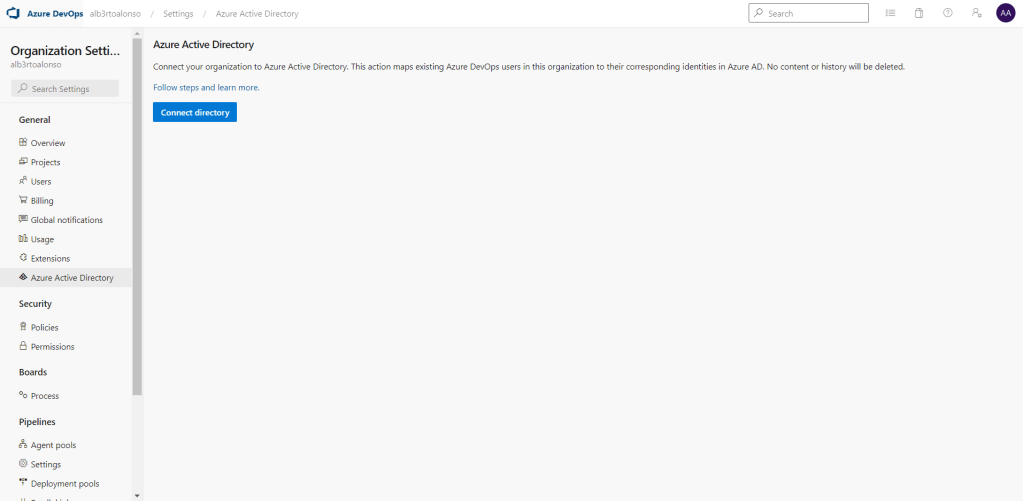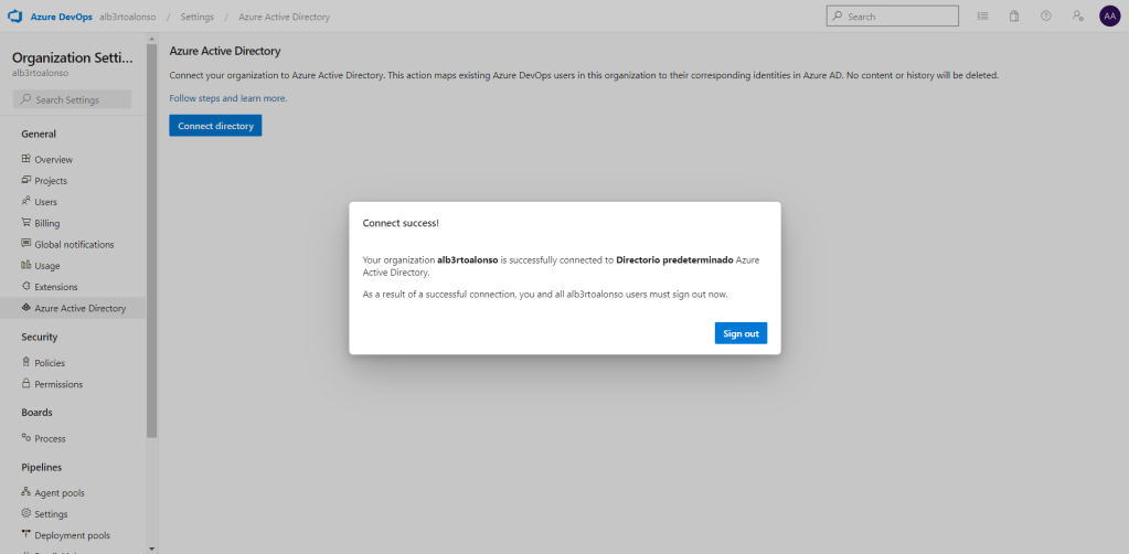 Ahora, elegimos el directorio y pulsamos el botón. Acto seguido veremos algo como lo de abajo. Tendremos que salir y volver a entrar en nuestro Azure DevOps y habremos concluido.
