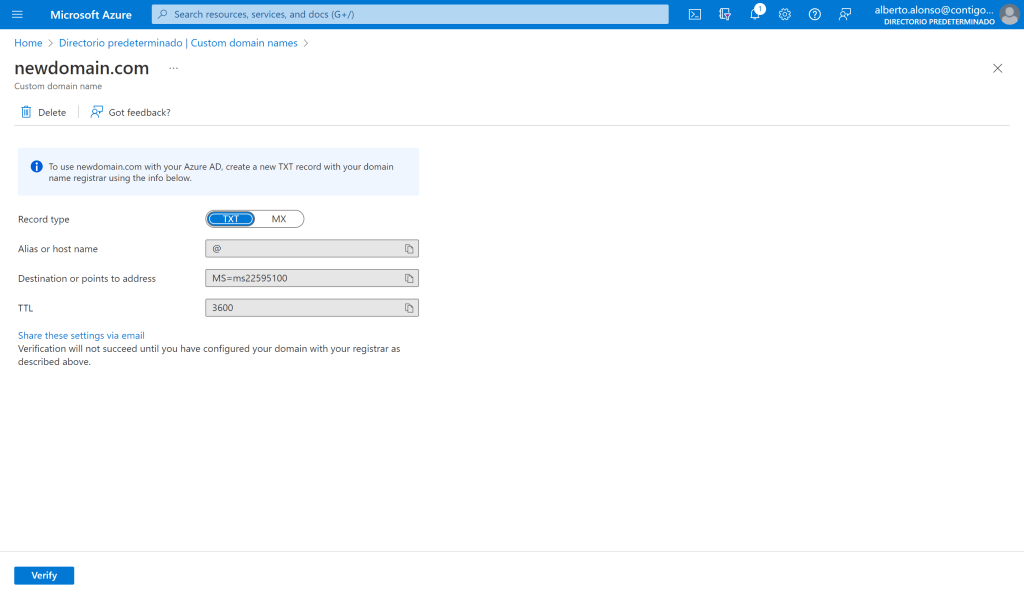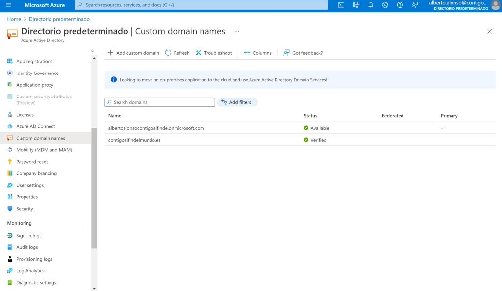Para ello, tan sólo debes ir al apartado custom domain del AAD y pulsar sobre crear uno nuevo.