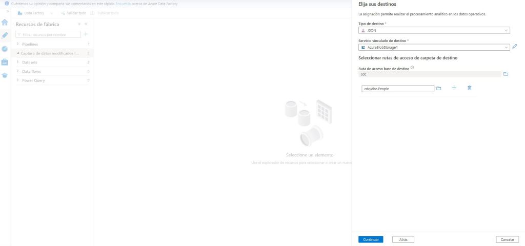 Y definir el destino, así como el formato con el que lo quieres persistir. En nuestro ejemplo fue alojar los registros extraídos en formato de fichero Json en un Blob Storage. Por supuesto, existen otras muchas alternativas, como puede ser .parquet, .csv, .delta,… así como sistemas de almacenamiento.