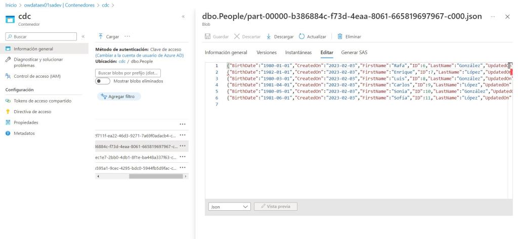 Tras un periodo realizando inserciones y actualizaciones en nuestra base de datos, podemos comprobar que el pipeline se ha ido ejecutando correctamente y si vamos a nuestro almacenamiento, podremos comprobar que los ficheros Json contienen los registros afectados en cada una de las ventanas. Para ejemplo, el de la última.