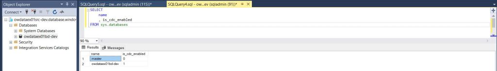 Lo primero es comprobar si en nuestra recién creada base de datos Azure SQL tiene habilitado el servicio CDC. Para ello sólo tenemos que ejecutar el comando que vemos en la imagen de abajo.