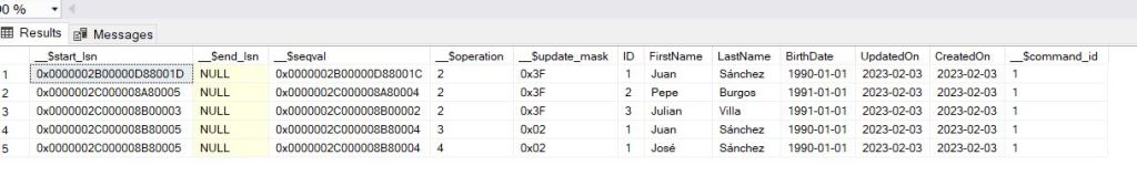 Como puedes observar en la imagen de arriba, existe un campo llamado __$operation con distintos valores. Así pues tenemos que el valor 2 indica una nueva inserción, mientras que el valor 3 informa de que sobre ese registro se ha producido una actualización y graba el valor antiguo, mientras que la operación con valor igual a 4 presenta el registro actualizado. Es decir, esta table de control de cambios nos permite hacer un tracking completo de nuestra tabla origen.