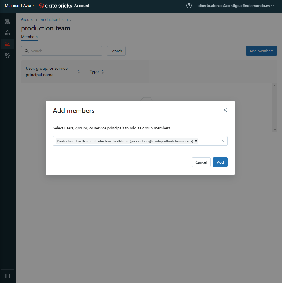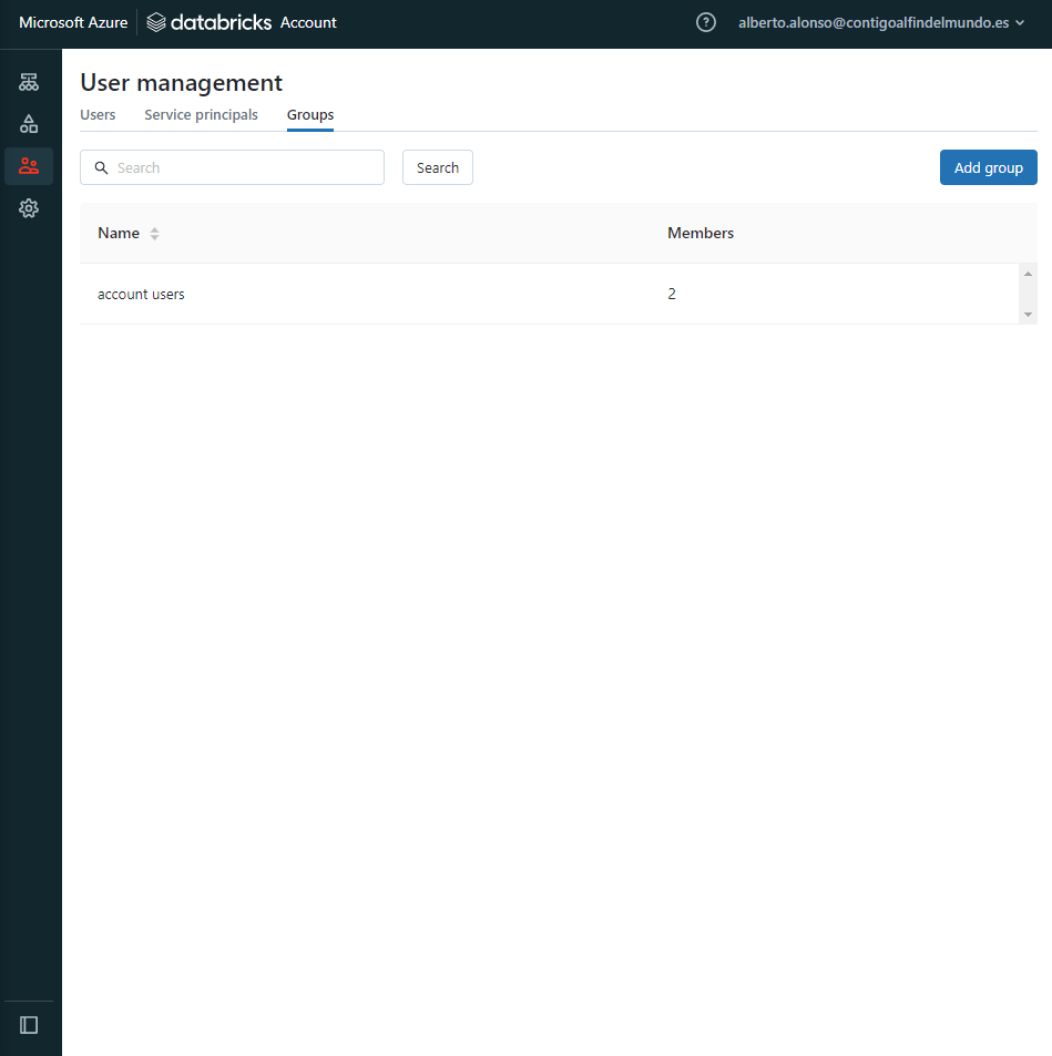 Para ello, lo primero es volver a la Databricks Account y pinchar en el icono de User Management en el panel de la izquierda. Acto seguido ir a la tab de Groups y pulsar sobre «Add group«