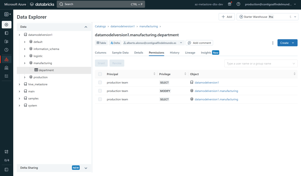 Para finalmente, desde el propio área de trabajo de Databricks asignar los permisos de «Data Editor» al grupo «production team» del que nuestro nuevo usuario es partícipe.