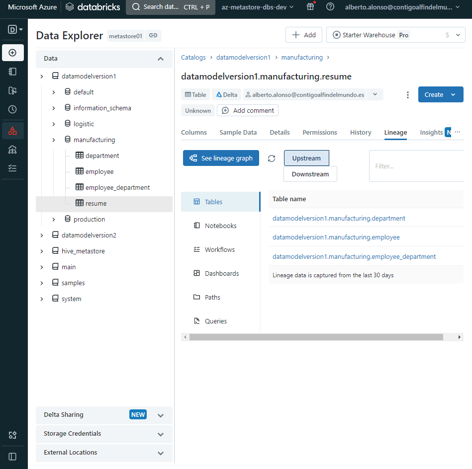 Aclarado este punto, comenzamos justo donde lo dejamos por entonces. En ese momento, tan sólo habíamos creado un par o tres de tablas en total para los schemas «production» y «manufacturing«. Bueno, pues además de crear algún que otro recurso adicional vamos a realizar el ejercicio de insertar registros en las tablas y finalmente crear una tabla resumen por cada uno de los schemas. Si bien, estas tablas se van a crear de dos modos distintos, para ver si Unity Catalog es capaz de tenerlo en cuenta y finalmente proveernos de la información de linaje del dato correctamente. ¡Veamos!