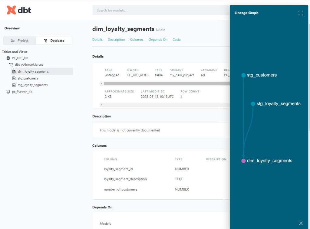Otro punto que me resultó interesante siempre y cuando no emplees el linaje de Unity Catalog en Databricks fue la capacidad de DBT de ofrecerte ese detalle. Sin duda una gran ayuda en la gestión de entidades corporativas de destino.