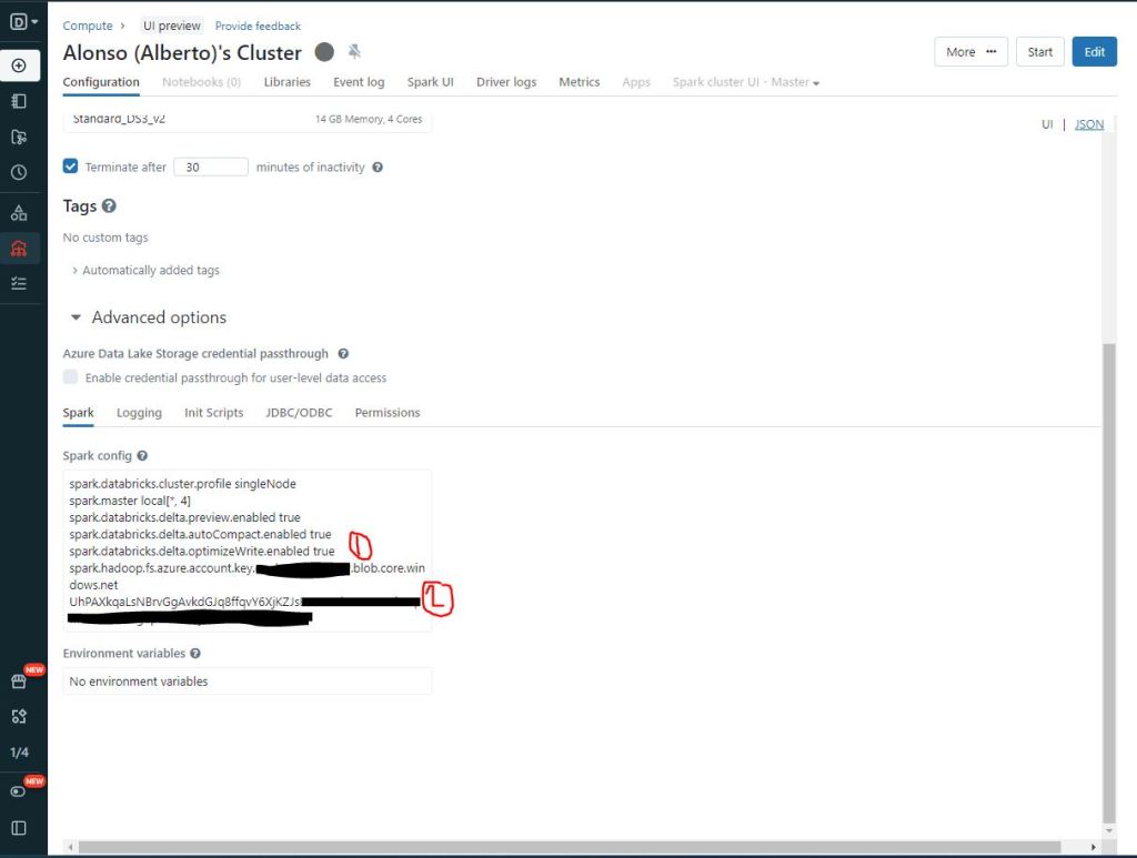 También es necesario aplicar una configuración avanzada sobre clúster de Databricks que empleemos en la ejecución de la actividad de copia en Data Factory. Como vemos en la imagen de abajo hay que incluir varias líneas de código para habilitar autoCompact, optimizeWrite y además incluir la Storage Account Key.
