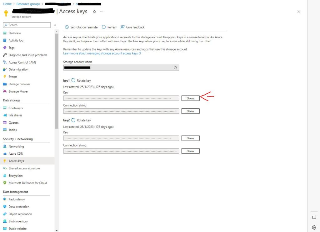 Aquí dejo una imagen para que recordéis dónde localizar la Key de la Storage Account.
