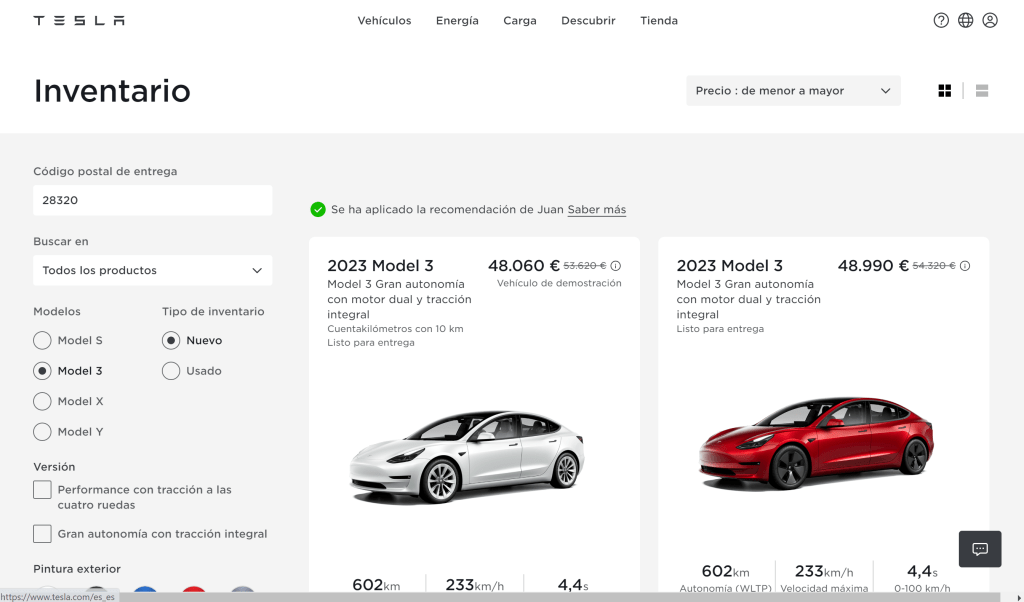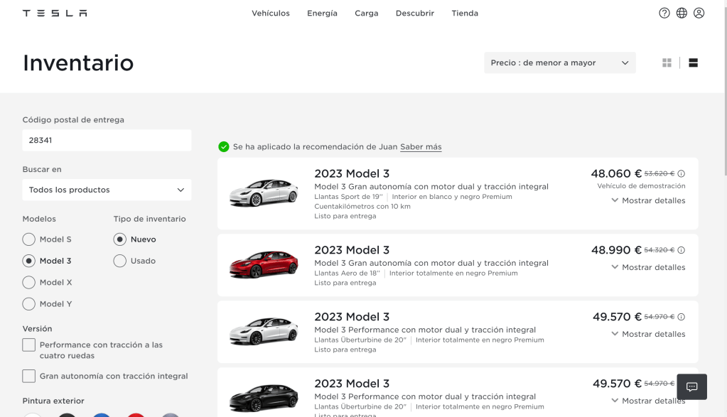 Por fin ha llegado el día de lanzarnos a la compra de Mortad3lo, que no será otro que el Tesla Model 3 Long Range de tracción trasera. Lo que viene a ser un unicornio pues tanto sólo está disponible en el inventario y además, vuela!