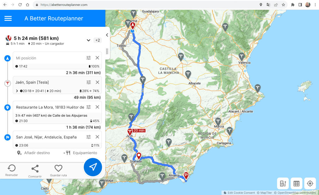 Por cierto, entre refresco y refresco de pantalla he sugerido un nuevo emplazamiento de Supercargadores en la A92 a la altura de Guadix. Creo que es una buena opción para completar el viaje a Almería sin sobresaltos o largas cargas en Jaén o Guarromán.